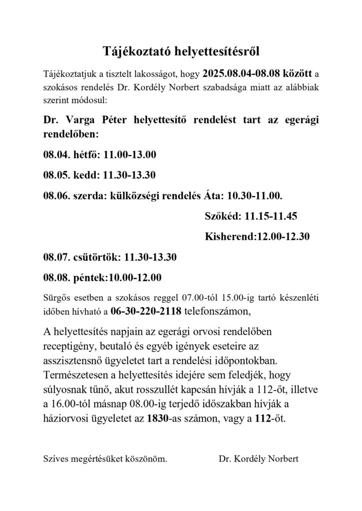 Értesítés háziorvosi helyettesítésről